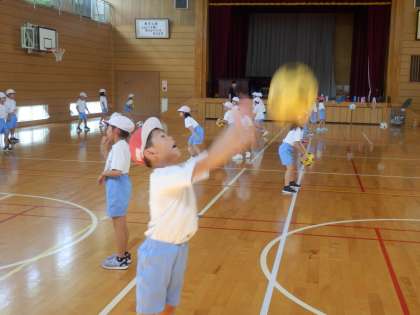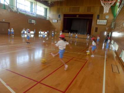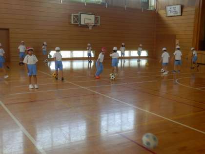 2年生の3時間目は体育の授業でした。サッカーの授業です。暑さ指数(WBGT)が厳重警戒を示していますので、グラウンドではなく体育館で行っていました。準備運動の後、まずは足ではなく手でバウンドパス。慣れてきたら、今度は実際に足で蹴ってのパス練習です。