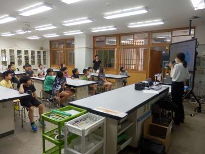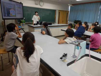 4年生は4時間目に外部から講師をお招きして下水道の出前授業を実施しました。スライドで下水道の役割や下水資源の再利用について学習したりしました。子どもたちが手を広げている写真は、「下水道の太さはどれくらい?」という質問に答えているところです。最後に「なぜティッシュはトイレに流してはいけないのか」を知るために、水の入ったコップにティッシュとトイレットペーパーを入れて、かき混ぜ実験を行いました。