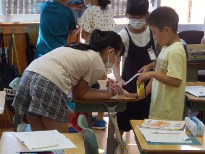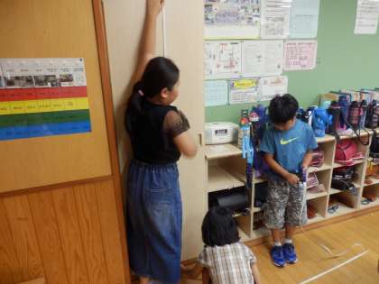 3/30 実物の長さを図る 公開日 2023/08/30 更新日 2023/08/30 教育活動 3年生の1時間目は算数の授業でした。電子黒板に巻き尺を投影して、巻き尺を使っての長さの測り方を確認した後、教室内のいろいろな物の長さを測っていました。教室の縦横の長さ、清掃用具入れの高さ、机の長さなどを班で協力して測っていました。 いいね(0)