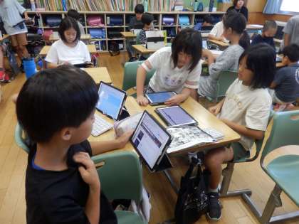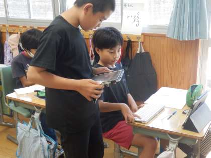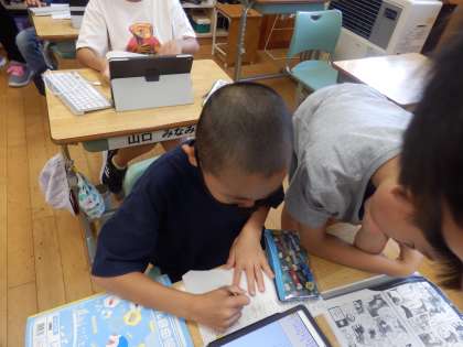 4年生の2時間目は理科の授業でした。自分の星座に関する神話についてインターネットで調べ、分かったことを自分の言葉でノートにまとめていました。まとめが終わった子はオクリンクというアプリで発表用のスライドを作っていました。