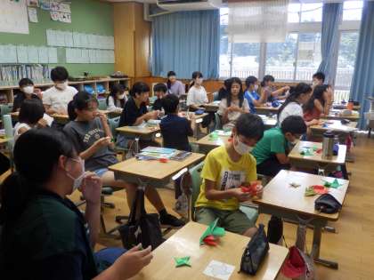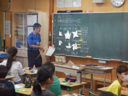 8/30 折り紙で作って 公開日 2023/08/30 更新日 2023/08/30 教育活動 6年生の3時間目は算数の授業でした。「対称」についての学習です。折り紙でかぶとや舟、手裏剣などいろいろな形を作っていました。「左右や上下の形が同じ」「180度回すと同じ形」など気づいたことを発表していました。 いいね(0)