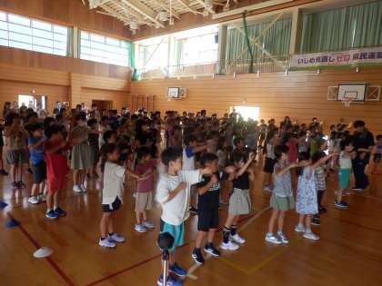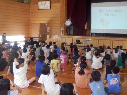PTA講演会では、体を動かしたり、クイズや謎解き、有名人の睡眠にまつわるエピソード、五小っ子2〜6年生の睡眠に関わるアンケート結果など、内容が豊富であっという間の30分間でした。小学生の内は睡眠時間は9時間以上、起きる時間は平日も休日も同じ時間に、寝る前1時間はスマホやゲームをしない(家族とのお話や読書が有効)ということが「よりよい睡眠」のは大切だとのことでした。