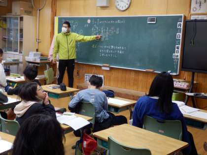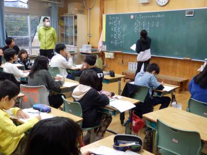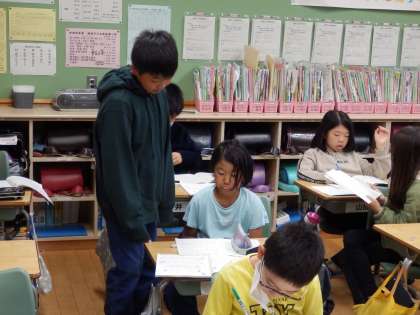 10/10 どちらが大きい? 公開日 2023/10/10 更新日 2023/10/10 教育活動 5年生の1時間目は算数の授業でした。「2/3と4/5ではどちらが数が大きいか」という問題に取り組んでいました。分母を3と5の公倍数の15にする考え方を発表され、それが通分であることを学びました。その後、問題に取り組み、先生の点検を受けた子達がミニティーチャーとして他の人に教えに行きます。 いいね(0)