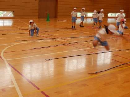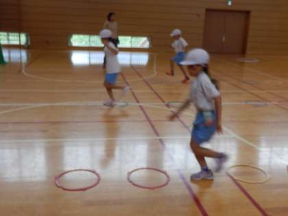 2年生の3時間目は体育の授業でした。輪を床に敷いて、片足跳びで進んだり、2本張ったロープを踏まないように飛び越したりと、遠くへジャンプする練習をしていました。