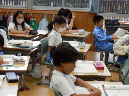 3年生の3時間目は国語の授業でした。4コママンガの展開を考えてオリジナルの物語を作る学習です。今日は第1から第4場面のあらすじを考えました。創造力を働かせて、ノートに書いていました。