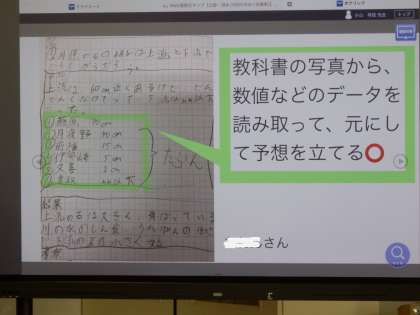 ある子どもが書いた振り返りです。教科書の載っている写真の中で、河原にある石の側に物差しが置かれているものがありました。ただし、あまりに小さすぎて私は目盛りが読めませんでした。そんな小さいところまでよく見て、振り返りで考えを書いているという素晴らしい姿がありました。