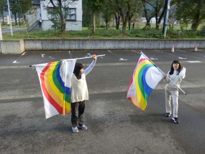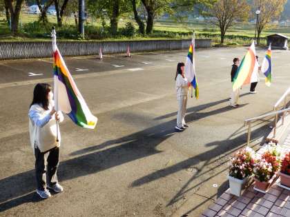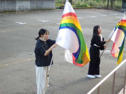 フラッグの練習の様子です。外での練習ですが、iPadで曲を流しながら練習していました。