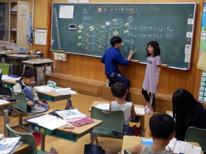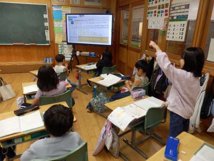 2年生の4時間目は算数の授業でした。「長さが3cmのテープがあります。このテープの1個分、2個分、3個分の長さは何cmですか」という問題に取り組んでいました。かけ算の3の段の学習です。かけ算のどういう式になるかを発表したり、3つの式で気づいたことを出し合っていました。