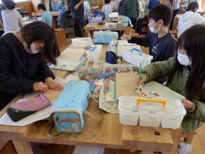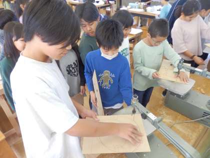 10/12 糸のこスイスイ 公開日 2023/10/12 更新日 2023/10/12 教育活動 5年生の5時間目は図工の授業でした。「糸のこスイスイ」という教材で自分がデザインしたミニ掲示板を作っています。今日は、下書きをした板を糸のこの機械で切ったり、下絵に絵の具で色を塗ったりしました。 いいね(0)