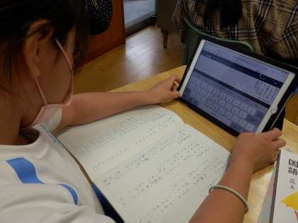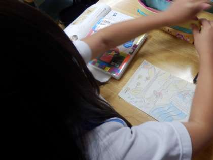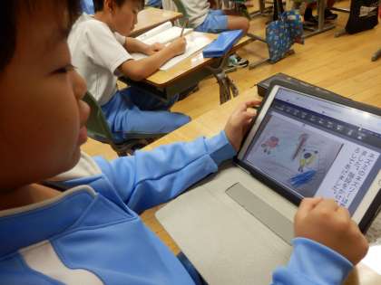 3年生の1時間目は国語の授業でした。iPadのオクリンクというアプリを使って、物語を作っています。ノートにビッシリと書き込まれた自作の物語を打ち込んだり、場面の内容に合うように挿絵を描いて貼り付けてていました。