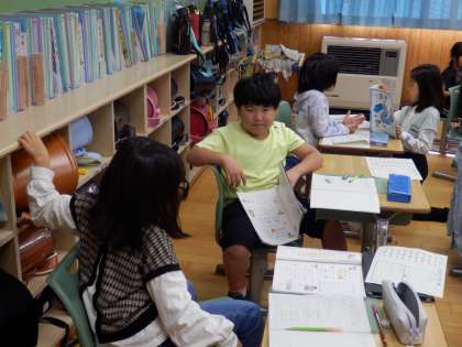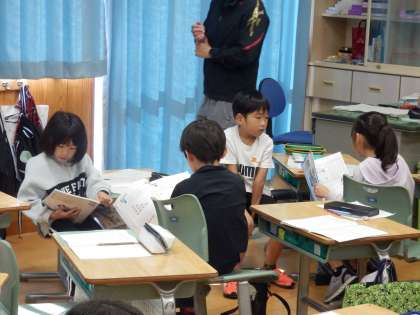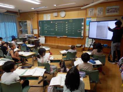 2年生の1時間目は算数の授業でした。九九の2の段の学習です。前の時間に学習した5の段と違って「が」が入ったり入らなかったり、「ん」が入ったりします。ペアで問題を出し合いながら、練習していました。
