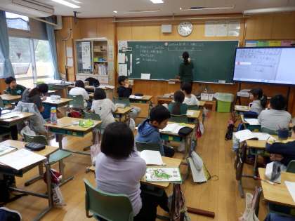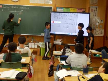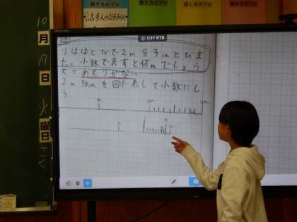 10/17 小数にして図で表す 公開日 2023/10/17 更新日 2023/10/17 教育活動 4年生の3時間目は算数の授業でした。「走り幅跳びで2m83cm跳びました。小数にして図に表すとどうなるでしょう」という問題に取り組んでいました。黒板に提示されたものさしでは小数点第一位までしか目盛りがありません。ノートに書いた自分の考えを発表したり、それを聞いた別の人がさらに説明したりしていました。自分のことばで相手に伝わるように説明することが大切な力です。 いいね(0)