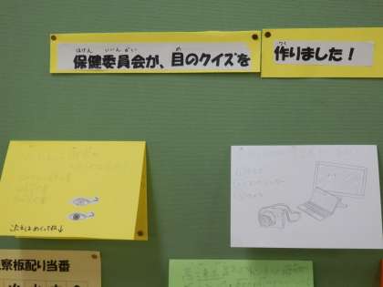 10/19 目を大切にしよう 公開日 2023/10/19 更新日 2023/10/19 教育活動 保健室前の掲示板です。保健委員会が「目」に関してのクイズを作ってくれました。「目」の健康のためにも、メディアの使いすぎに気をつけてほしいです。 いいね(0)