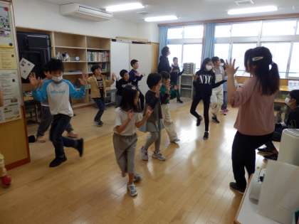 昼休みのダンス練習の様子です。武道場とにじいろ学級2組の教室です。