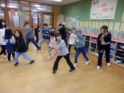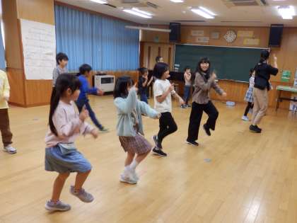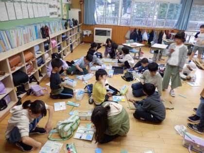 音楽室、2年生教室、5年生教室の様子です。2年生教室では発表の時に使う小物を作っていました。