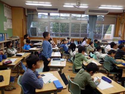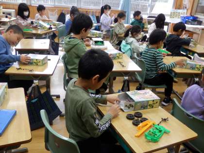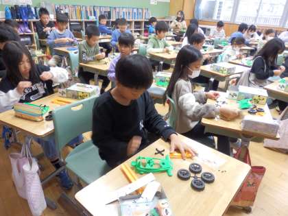 3年生の1時間目は理科の授業でした。今日から「風」についての単元です。まずは「風」について知っていることを発表していました。たくさんの考えが出されました。その後、風力を利用して走る車作りです。今日はまず、風車の部分を作りました。