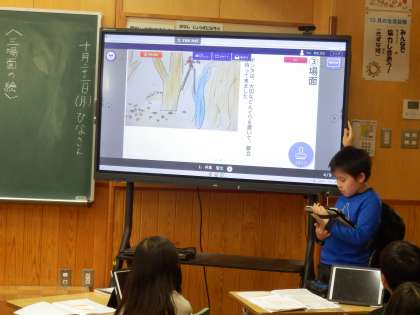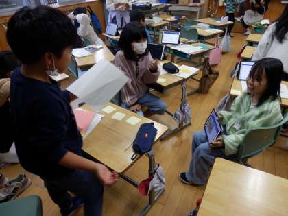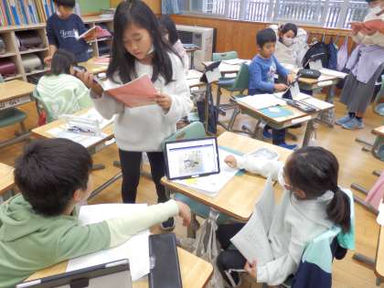 10/23 オリジナルの物語を発表 公開日 2023/10/23 更新日 2023/10/23 教育活動 3年生の5時間目は国語の授業でした。4コママンガをもとにしたオリジナルの物語の発表をしていました。3コマ目の山場は内容も絵も自分で作ります。まずは班ごとで発表し合い、終わったら付箋に感想を書いて送り合います。付箋びっしりに感想を書いている子がたくさんいました。その後、各班、代表者を決めて、みんなの前で発表しました。 いいね(0)