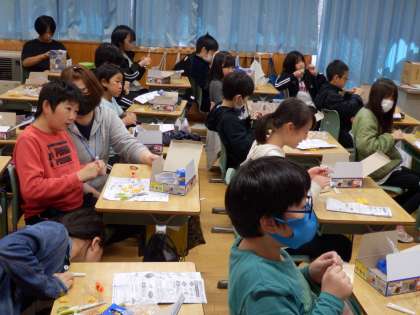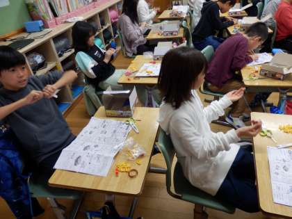 5年生の4時間目は理科の授業でした。電池で磁力を発生させる電磁石キットを作っていました。みんな、導線のビニールの膜を剥ぐのに苦労していました。