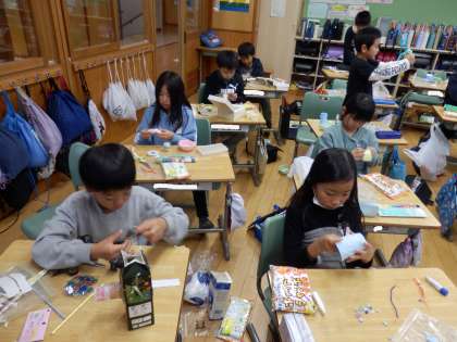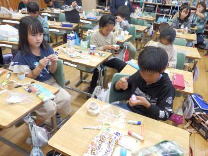 10/24 空き容器を素敵に 公開日 2023/10/24 更新日 2023/10/24 教育活動 3年生の6時間目は図工の授業でした。家から持ってきたタマゴのパックやお菓子の箱、のりの佃煮のビンなどの空き容器を紙粘土やビーズ、モールなどで素敵に飾り付けをしていました。紙粘土には好きな色の絵の具を混ぜて色づけもしていました。 いいね(0)