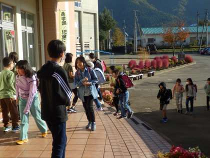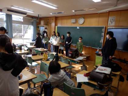 今日は4年生と生活委員会があいさつ運動を行いました。生活委員会が玄関前や各教室を回っている様子です。