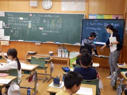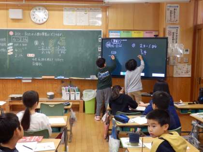 10/25 1ケタと3ケタの小数の筆算 公開日 2023/10/25 更新日 2023/10/25 教育活動 4年生の1時間目は算数の授業でした。4−2.14のような1ケタと3ケタの小数の計算をどうやったらよいか考えました。まずは先生が間違ったやり方を黒板に書き、なぜそれだと間違いなのか、正しく計算するにはどうしたらよいか考えを発表しました。「繰り下がり」を確認し、電子黒板で練習問題に取り組みました。 いいね(0)