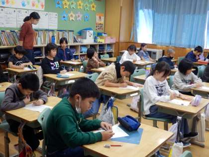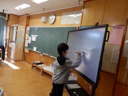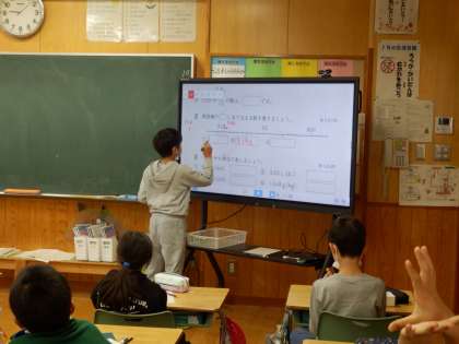 4年生の1時間目は算数の授業でした。数直線に目盛りと3,19、3.2、3.21と数値が入った図があります。間の数値が何かを考えていました。小数の単元は分数と同様につまずきやすいところになります。しっかり身に付けてほしいです。