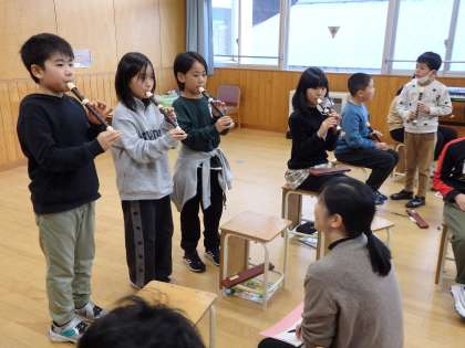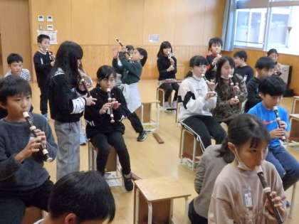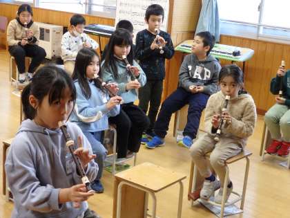 3年生の5時間目は音楽の授業でした。「パフ」という曲をリコーダーで演奏する練習をしていました。黒板に音階が書いてあるので、それを見ながら練習します。「吹ける!」という子は手を挙げて、先生の前で演奏し、正しく吹けているか確認してもらいます。