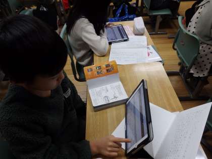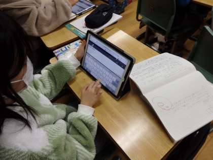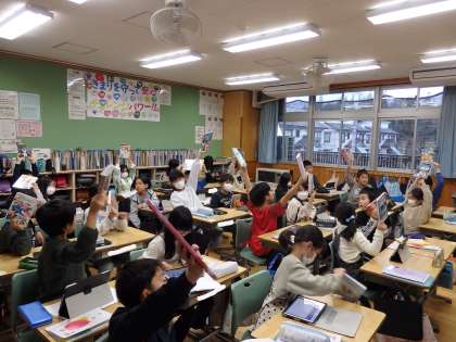 3年生の1時間目は国語の授業でした。「お気に入りの本」を紹介するスライドを作っていました。図書室にから1冊ずつ本を借りてきて、お気に入りの理由、おすすめポイントなどと、表紙の写真などを入れながらスライドを作っていました。