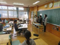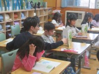 3年生の3時間目は算数の授業でした。「紙を二つの折って、下の辺を3cm、斜めの辺を5cmに切ってできた三角形」が二等辺三角形になることを確認して、自分たちで1辺が3cmの正三角形を作っていました。まだ、正三角形の1つの角が何度になるのか学習していませんので、辺の長さだけが頼りです。苦戦していましたが、見事、正三角形ができあがりました。