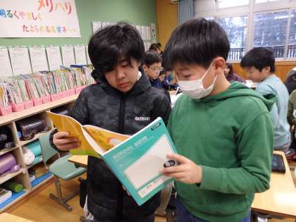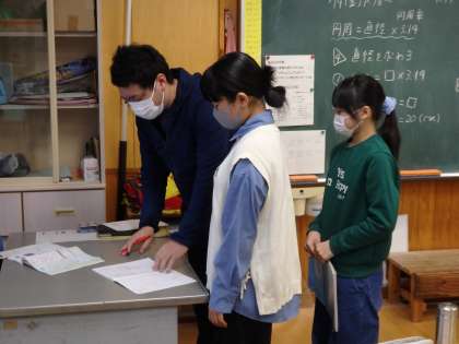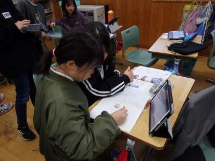 5年生の1時間目は算数の授業です。円の面積を求める公式の応用です。「面積が62.8平方センチメートルのときの円の直径」を求めていました。友達と解き方を確認し合いながら考えていました。中学校で学習する文字式につながる学習ですね。