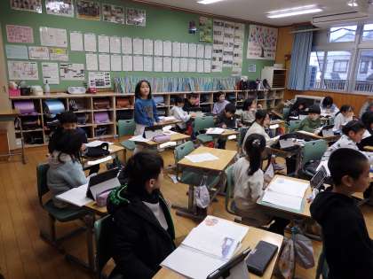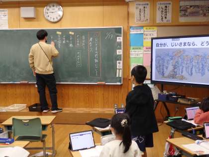 2年生の1時間目は国語の授業でした。「笠こ地蔵」の学習です。昨日、おじいさんが自分の手ぬぐいを地蔵に巻いた行動について、「自分だったらするかしないか」を考えました。今日は意見の発表です。先生からの「おじいさんは、何かいいことがあるのを期待してやったの?」というつっこみ質問で、さらに深く考えていました。