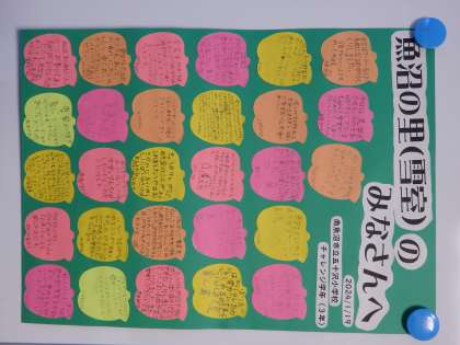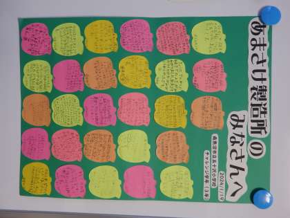 1/19 3年生からお礼のメッセージ 公開日 2024/01/19 更新日 2024/01/19 教育活動 学校へ戻ってきてから、2つの工場へお礼のメッセージを書きました。みんながとても丁寧に描いていました。 いいね(0)