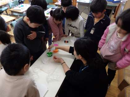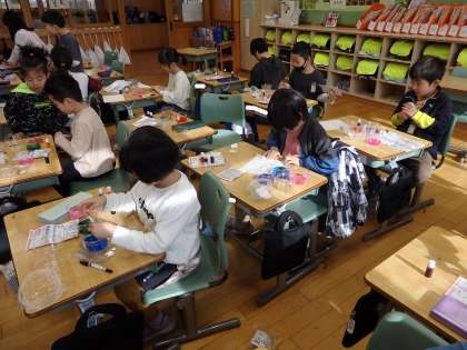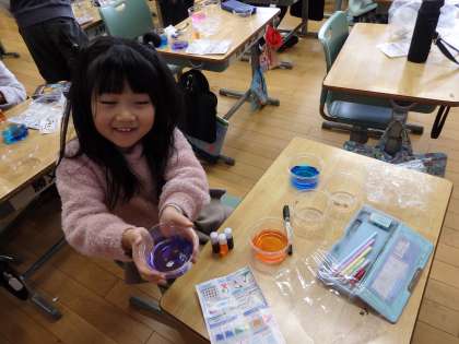 1/22 好きな色を自分で作って 公開日 2024/01/22 更新日 2024/01/22 教育活動 1年生の2時間目は図工の授業でした。「カラフル色紙」という教材です。3種類の色の液体を組み合わせて水に溶かし、自分が好きな色を3種類作ります。次は和紙を折りたたんで、3つの液体につけていくと、きれいな模様のついた和紙ができあがりです。子どもたちはピンクや紫、緑などいろいろな色を作り出していました。 いいね(0)
