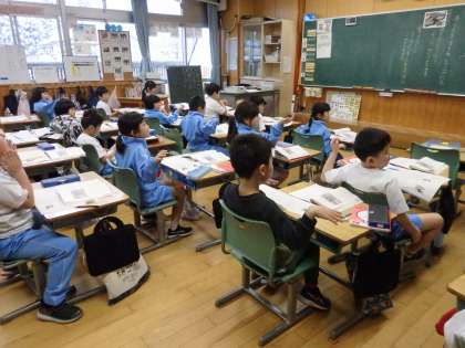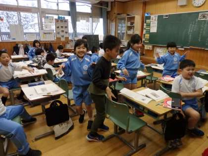 1/24 文の内容を体で表現 公開日 2024/01/24 更新日 2024/01/24 教育活動 1年生の1時間目は国語の授業でした。「子どもたちを守る動物たち」という文の内容の読み取りです。「コチドリの親は、敵を見つけると、早足で巣から遠ざかります。そして鳴き声を上げ、羽をバサバサと羽ばたかせます」という一説を読んで、みんなでどんな感じなのか実際にやってみました。 いいね(0)