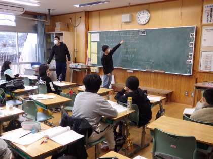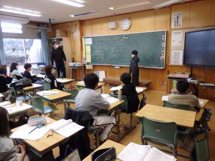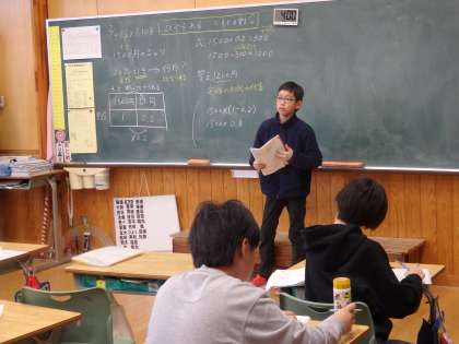 2/9 いろいろな子が説明 公開日 2024/02/09 更新日 2024/02/09 教育活動 5年生の1時間目は算数の授業でした。「1500円のシャツの20%引きはいくらになるか」という問題に取り組んでいました。2通りの求め方がありますが、そのうちの一つ「1500×0.8」について、なぜその式になるのかをいろいろな子が前に出て説明していました。写真の3人だけではありません。 いいね(0)