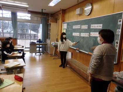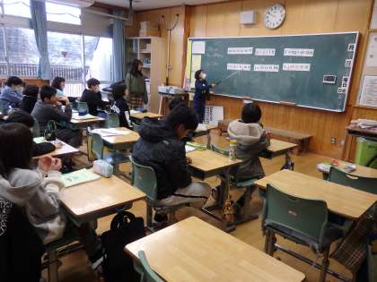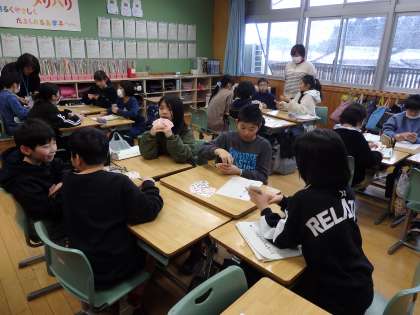 5年生の2時間目は国際科の授業でした。まずはALTの先生とアルファベットの読み方の学習です。1人ずつ前に出てきて6つのグループを1つずつ発音し、そのあとに続いて、みんなで発音練習。しっかり身振り手振りもつけています。その後、「〜さんが〇〇が得意です」という表現の練習です。班ごとにトランプで「じじ抜き」をしながら、英語を言う練習をしていました。