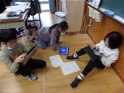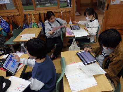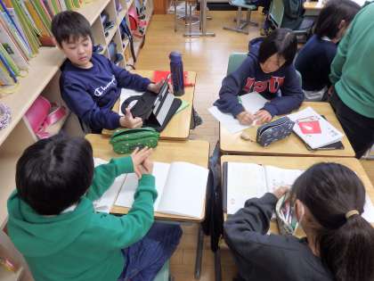 4年生の2時間目は国語の授業でした。前回の授業で、班ごとに取ったアンケート結果をiPadでグラフにまとめましたが、今日は1人1人が作ったグラフをiPadのオクリンクというアプリで1つのスライドにして、発表の準備です。スライドを作ったり、誰がどの部分を発表するか話し合っていました。