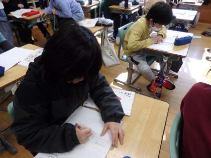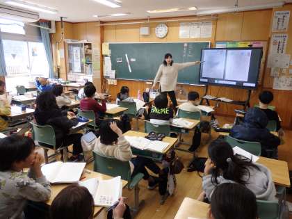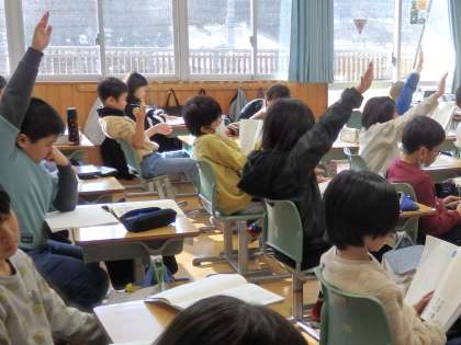 4年生の1時間目は国語の授業でした。アンケート結果についての発表原稿を作ります。班ごとで分担を決めた質問項目について、教科書の例を参考にしながら、各自で原稿をノートに書いていました。発表にはクラスのみんなへの提言も入れていきます。