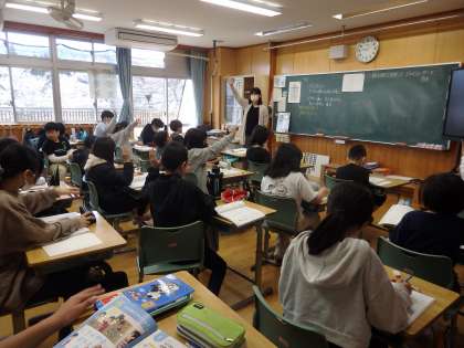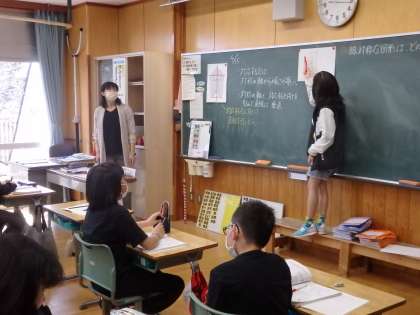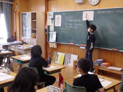 4/15 線対称な図形を描く 公開日 2024/04/15 更新日 2024/04/15 教育活動 6年生の1時間目は算数の授業でした。線対称な図形はどうやって描いたらよいか学習しました。対象の点が中心となる線から何マス目にあるのか数えて描くやり方と「たて何マス、横何マス」にあるか数えるやり方の2通りの考えが発表されました。発表する人の体と顔の向きがしっかりみんなの方を向いていますね。 いいね(0)