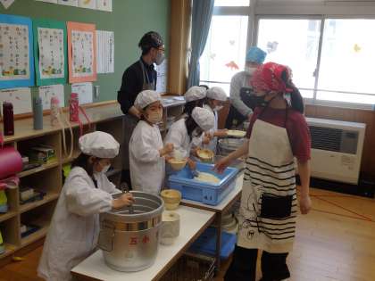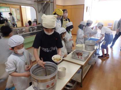 今日は1年生の2回目の給食です。5,6年生が準備のお手伝いに来てくれていました。5,6年生に教えてもらいながら、自分たちで給食の盛り付けをすることができました。