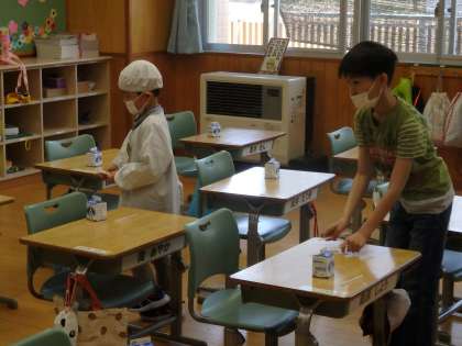 4/15 1年生の給食準備
