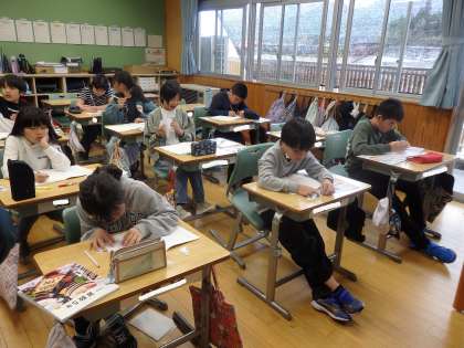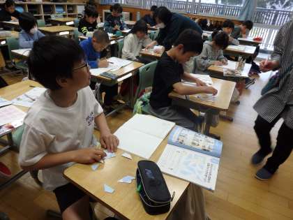 4/16 合同な図形とは? 公開日 2024/04/16 更新日 2024/04/16 教育活動 5年生の1時間目は算数の授業でした。「合同な図形」についての学習です。1枚目の写真の黒板にあるようなパズルの空いているところにピッタリはまる形はどれかを探し出していました。「ハマった!」「できた!」と喜びながら、先生に見せる子どもたちでした。 いいね(0)