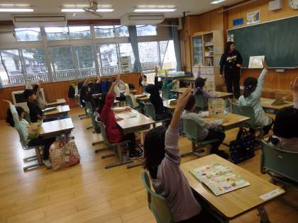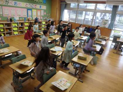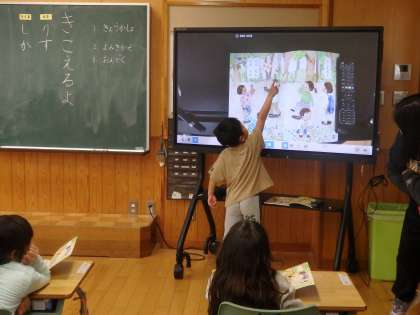4/16 聞こえるよ 公開日 2024/04/16 更新日 2024/04/16 教育活動 1年1組の3時間目は国語の授業でした。「聞こえるよ」という文の学習です。まずは音読。文章の内容に合わせて、ジャンプしたり、耳をすませたりなどの身振りを入れながら元気に音読ができました。先生の「どんな動物がいるかな?」の質問に、まっすぐピンと手を挙げて「ハイッ!」と1回だけの返事。とてもいいですね。 いいね(0)
