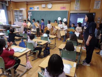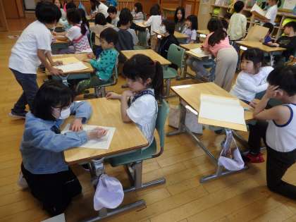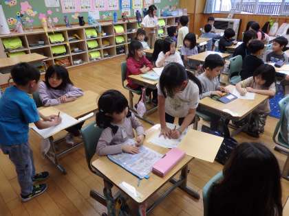 4/16 1年生にインタビュー1 公開日 2024/04/16 更新日 2024/04/16 教育活動 3年生の「1年生ようこそ週間」の取組の1つとして、5時間目にインタビューを行いました。「好きな色」や「好きな食べ物」などについて聞いていきます。膝をついて弥山を下げ、優しくインタビューをしていますね。1組の様子です。 いいね(0)