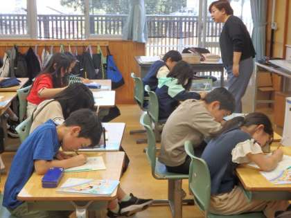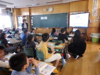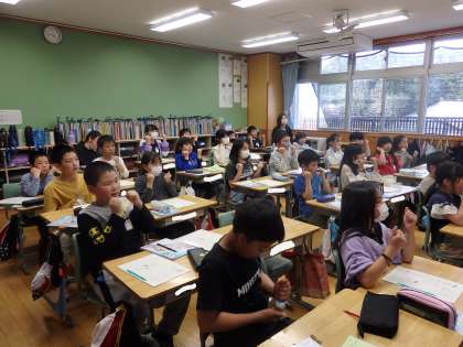 4/16 しっかりジェスチャーをつけて 公開日 2024/04/16 更新日 2024/04/16 国際科 4年生の5時間目は国際科の授業でした。まずはALTの先生とフォニックスというアルファベットの「音読み」の学習です。文字の音にちなんだジェスチャーをしながら、発音しますが、みんな、しっかりジェスチャーを覚えていますね。その後、小文字の「g」の描き方を学習したり、世界のいろいろな国のあいさつについて学習したりしました。 いいね(0)