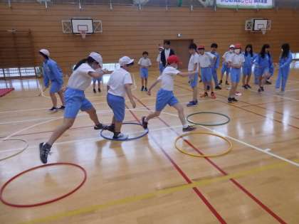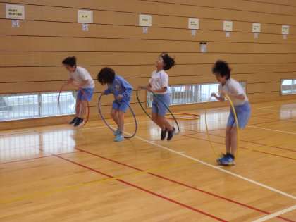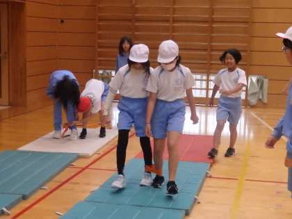 6年生の3時間目は体育の授業でした。フラフープや、ミニハードルなどを使って、班ごとで考えた、オリジナルの障害物競走をしていました。「よくこんな競技、考えたなぁ。」と感心するばかりです。2人1組のリレーで競争をしましたが、赤組、白組共に声援が飛び交っていました。中には併走して声を掛けている子もいました。