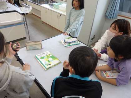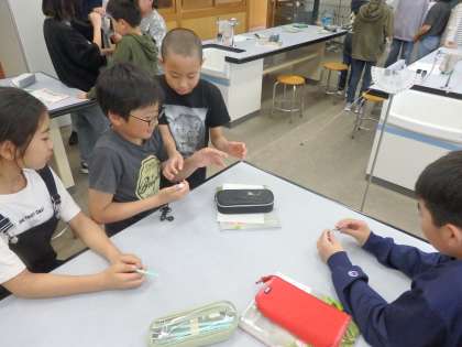 5年生の5時間目は理科の授業でした。振り子の実験で、「50度の角度から振って、10往復するまで何秒掛かるか」という実験を行いました。振り子のおもりの重さ、ひもの長さ、角度がどう関係するのか確かめる実験です。班で協力して、役割分担をし、「1,2,3・・・」と元気よく数えていました。