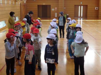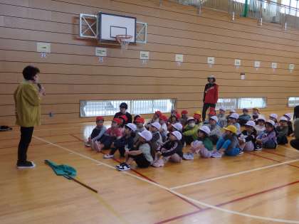 1年生は初めて行う避難訓練でしたので、2〜6年生が教室で振り返りをしている間、2列での整列の仕方や点呼の受け方などについての話を聞きました。横の人とそろって2列に並ぶと素早く点呼ができるということを学びました。