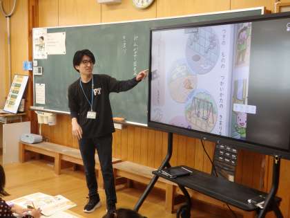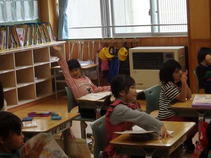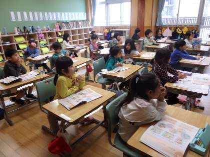 1年2組の2時間目は道徳の授業でした。「みんなで守ろう」というページに描かれている、廊下やグラウンドやトイレなど、学校内のいろいろな場所や用具のイラストを見ながら「きまりの大切さ」や「もしも、きまりがなかったらどうなるか」について考えました。