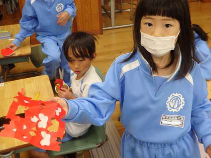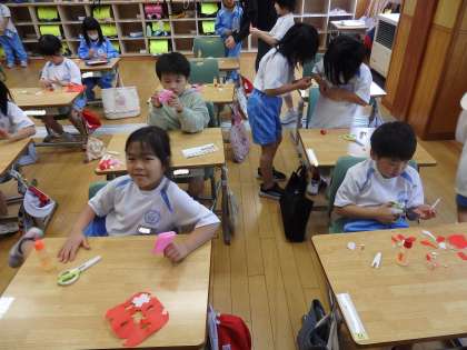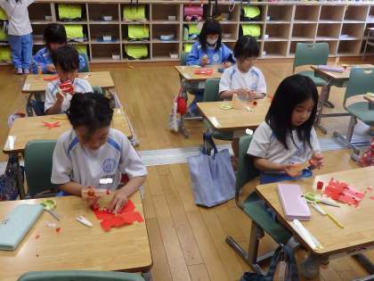 5/9 チョキチョキかざり 公開日 2024/05/09 更新日 2024/05/09 教育活動 1年2組の3時間目は図工の授業でした。折り紙を折って、ハサミで好きな形で切り抜いて作品を作る「チョキチョキかざり」を行っていました。切り抜くだけではなく、折り紙の白い部分を貼り付けて模様も付けます。素敵な飾りができました。 いいね(0)